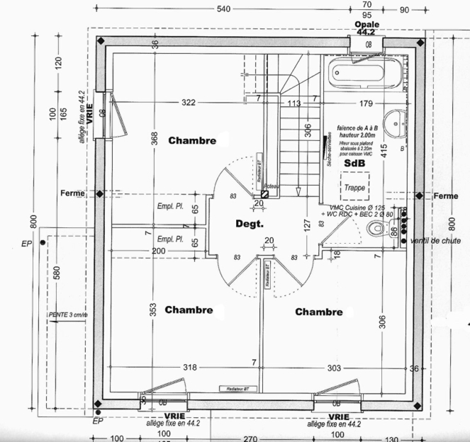 – A l’étage : Un palier desservant trois chambres de 9 à 11 m², Une salle de bains avec WC
